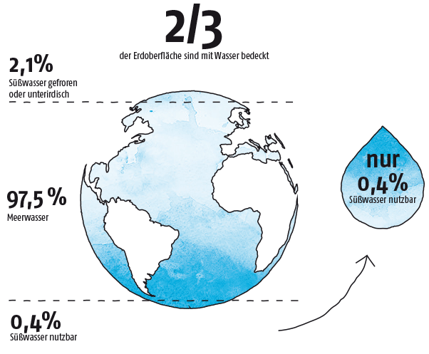 Die Oberfläche unserer Erde ist zu etwa zwei Dritteln mit Wasser bedeckt. Das gesamte Wasservolumen wird auf 1400 Millionen Kubikkilometer (1 Kubikkilometer sind 1 Billionen Liter) Wasser geschätzt. Ein Großteil des Wassers ist Salzwasser (97,5 Prozent) in den Meeren und damit für Menschen nicht genießbar. Nur 2,5 Prozent, also etwa 35 Millionen Kubikkilometer Wasser sind Süßwasser und kann von den Menschen genutzt werden. Ein Großteil des Süßwassers ist in Gletschern, der Arktis und Antarktis gebunden oder befindet sich als Grundwasser tief unter der Erde. Für uns Menschen zugänglich ist nur ein ganz geringer Prozentsatz von etwa 0,4 Prozent des Süßwassers in Seen, Flüssen, Regen und unterirdisch gespeichertem Grundwasser. Diese 5,6 Millionen Kubikkilometer Wasser teilen wir Menschen und mit all den Tieren und Pflanzen auf den Kontinenten.