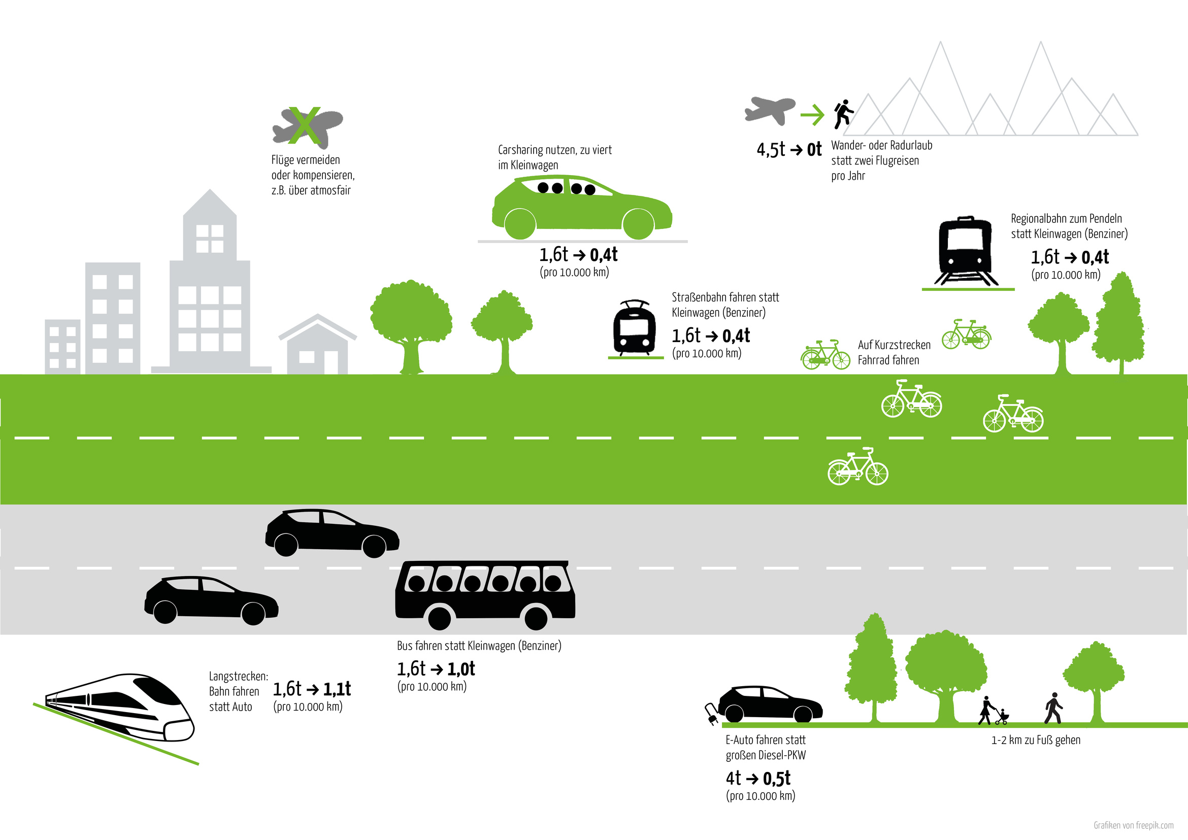 Hier siehst du auf einen Blick, welches Verkehrsmittel wie viel CO2 verbraucht und wie viel durch Alternativen eingespart werden kann.